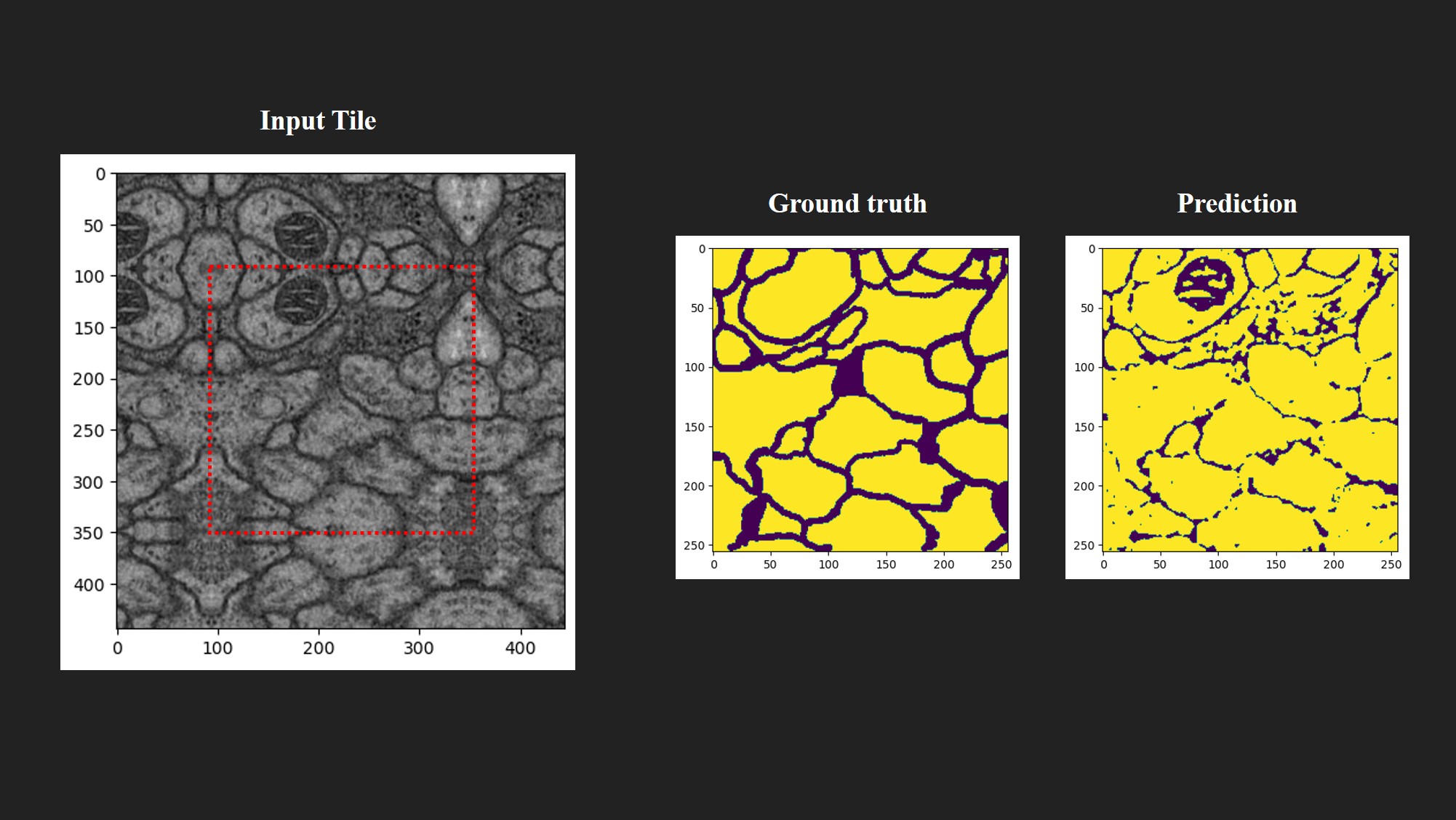 Input tile의 빨간색 부분이 실제 예측 범위이고, 나머지는 Overlap-tile을 통해 반사된 영역이다. 아쉽게도 Groudn truth처럼 완벽한 경계인식이 이루어지지는 않았다. 또한, 원본 이미지의 미토콘드리아(? 맞는지는 모르겠다.)까지 세포벽으로 인식하여 경계로서 예측하였다.