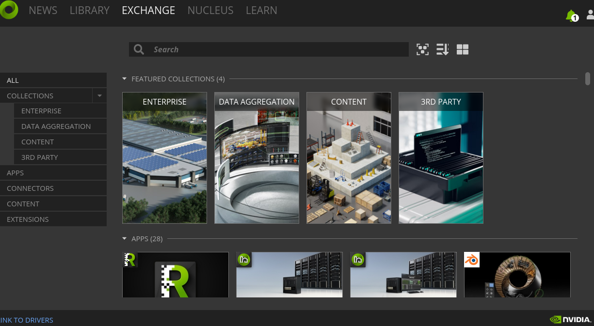 로그인까지 완료되면 omniverse launcher를 사용할 수 있다. EXCHANGE를 눌러주면 Isacc sim을 비롯한 다양한 app과 extension 프로그램들을 볼 수 있다.